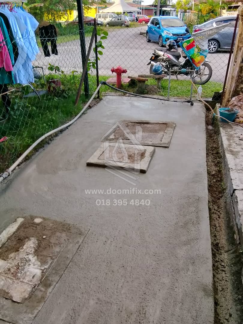 Kerja dimulakan dengan pembersihan tapak, perataan tanah, pemasangan besi dan seterusnya tuangan konkrit slab dibuat dengan kemas serta ikut spesifikasi.