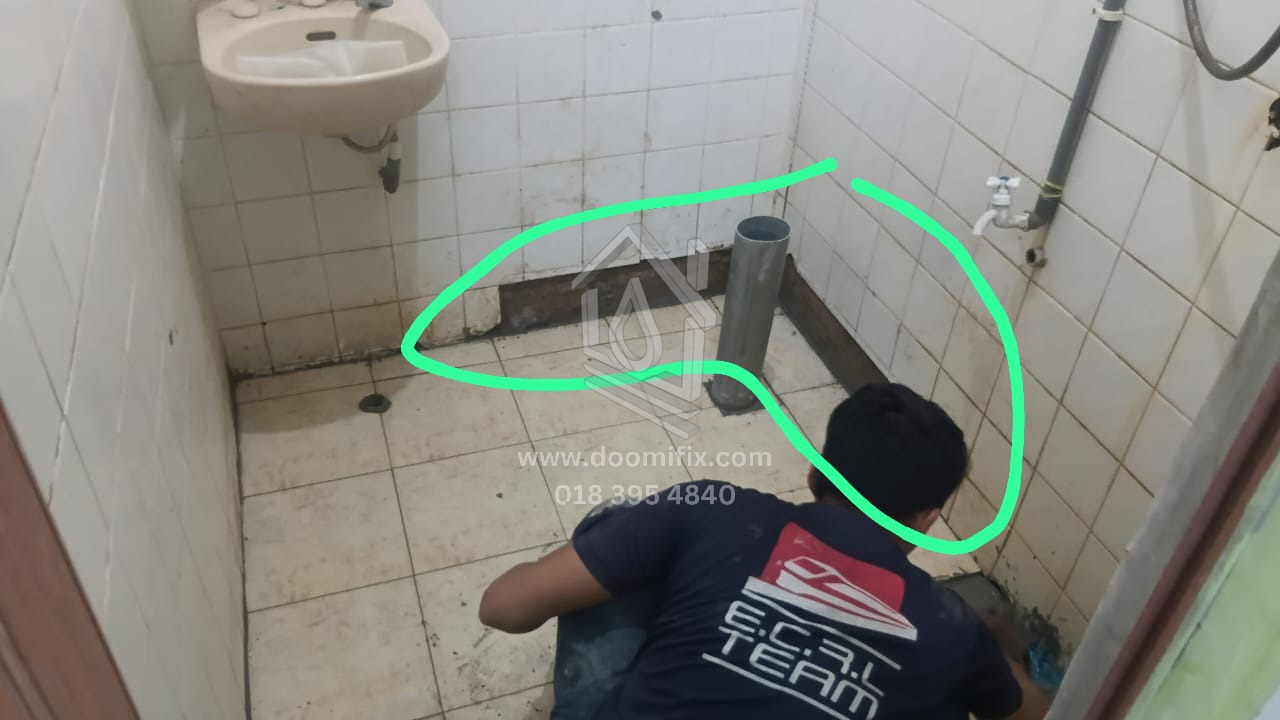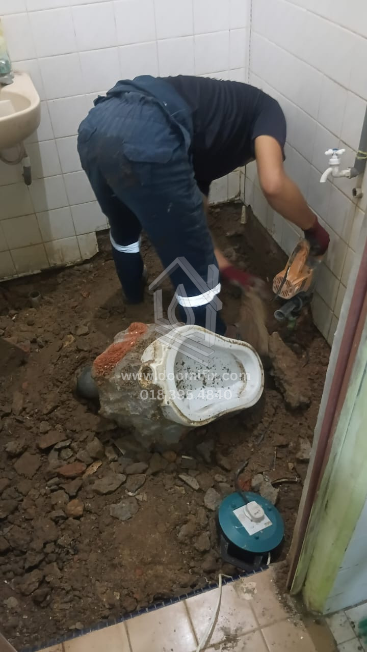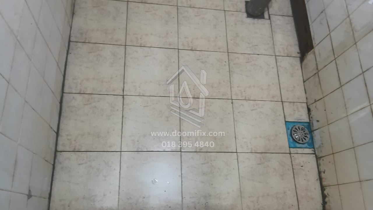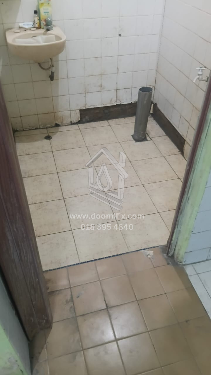 Kerja-kerja hacking semula lantai telah selesai, diikuti dengan kerja re-render sebelum pemasangan mozek. Mozek bersaiz 1ft telah dipasang. Selain itu, mangkuk tandas lama telah ditanggalkan, dan S-trap di bahagian bawah dibuang serta digantikan dengan paip baharu yang sesuai untuk pemasangan tandas duduk.