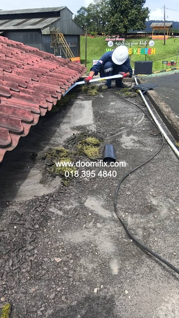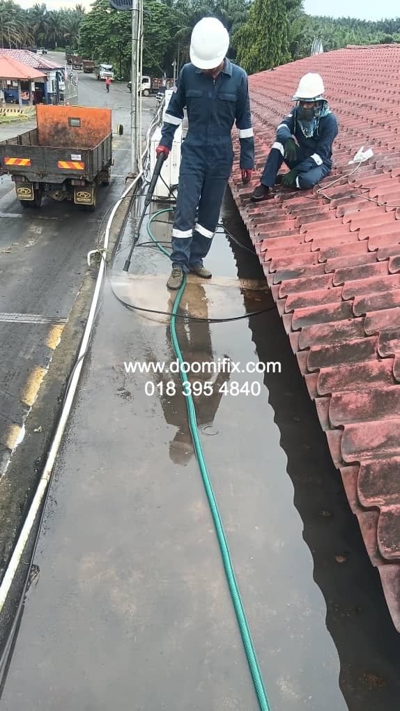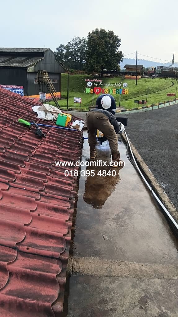 Macam dalam gambar tu, team Doomifix.com tengah buat kerja kat tapak projek — siap panjat bumbung, check kebocoran, bancuh bahan waterproofing, semua on point.