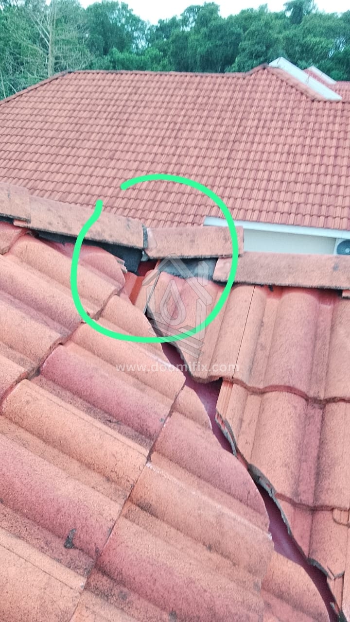 Antara SUSPEK UTAMA kes atap bocor client kami kali ini.. monyet / musang yang berlari di perabung atap! BUKTInya..banyak atap-atap/perabung yang sudah tecabut/pecah!