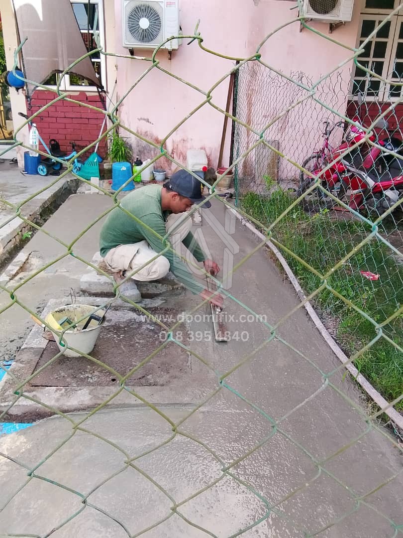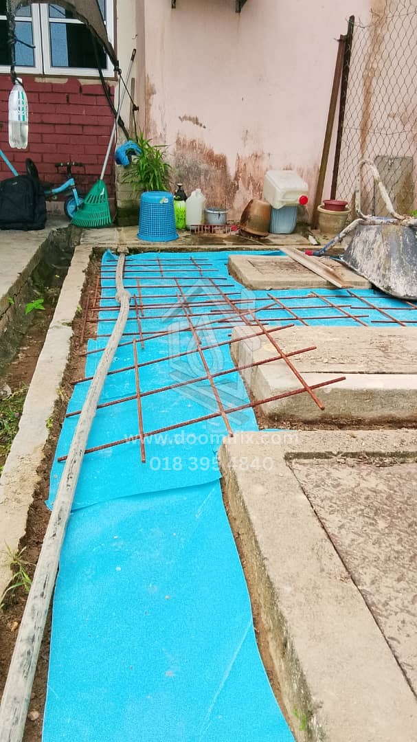 Kerja dimulakan dengan pembersihan tapak, perataan tanah, pemasangan besi dan seterusnya tuangan konkrit slab dibuat dengan kemas serta ikut spesifikasi.