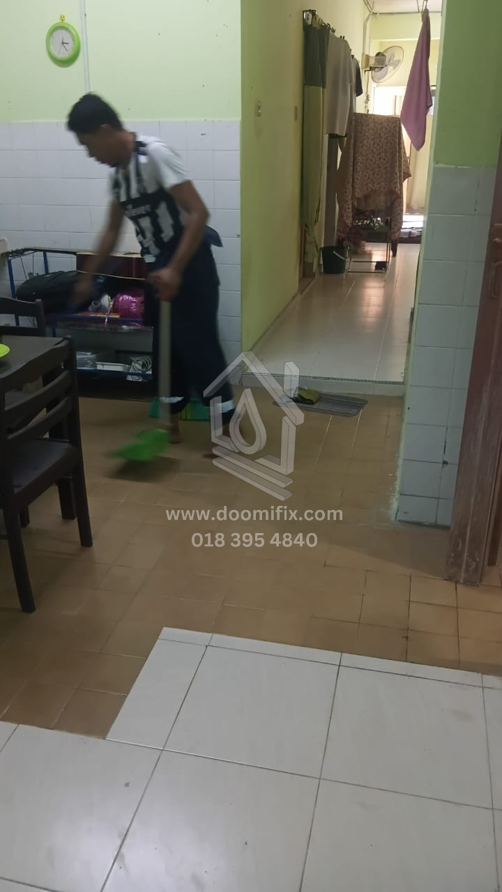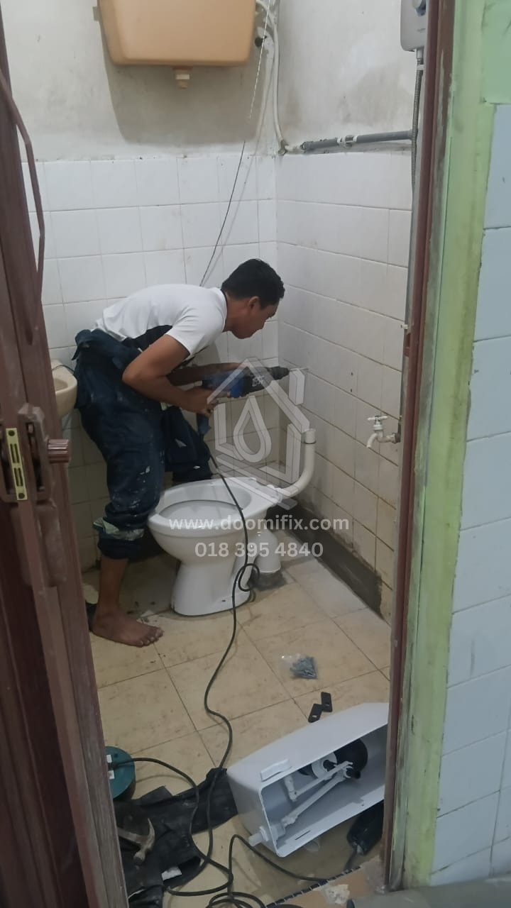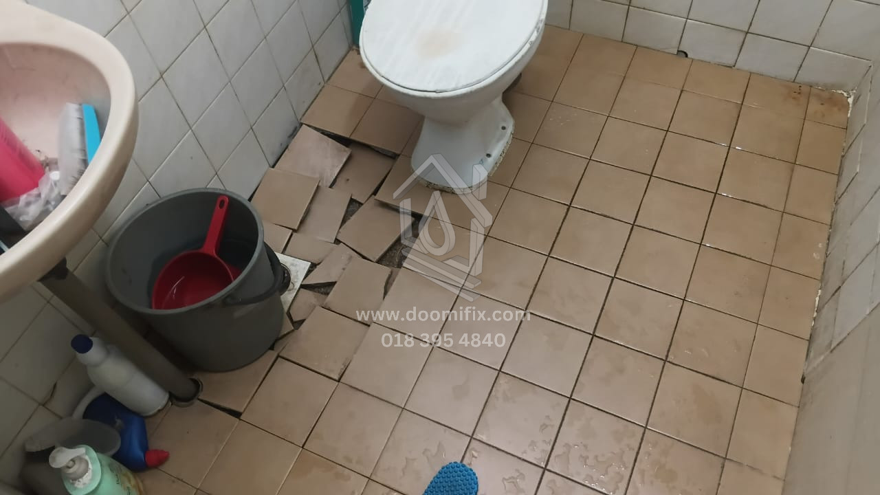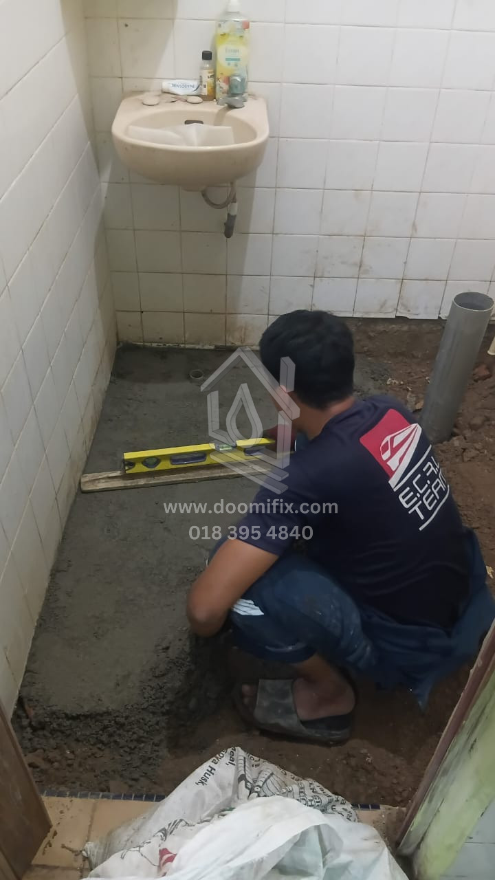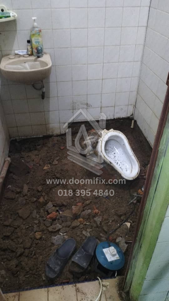 Kerja-kerja hacking semula lantai telah selesai, diikuti dengan kerja re-render sebelum pemasangan mozek. Mozek bersaiz 1ft telah dipasang. Selain itu, mangkuk tandas lama telah ditanggalkan, dan S-trap di bahagian bawah dibuang serta digantikan dengan paip baharu yang sesuai untuk pemasangan tandas duduk.