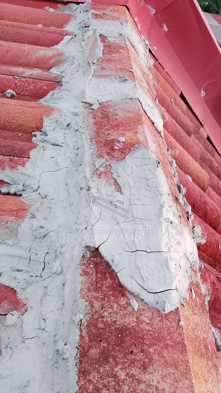 Roof ridge pun penting. Kalau simen crack dan takde lining, hujan mudah masuk. Kami akan install lining dan repair simen untuk better protection.