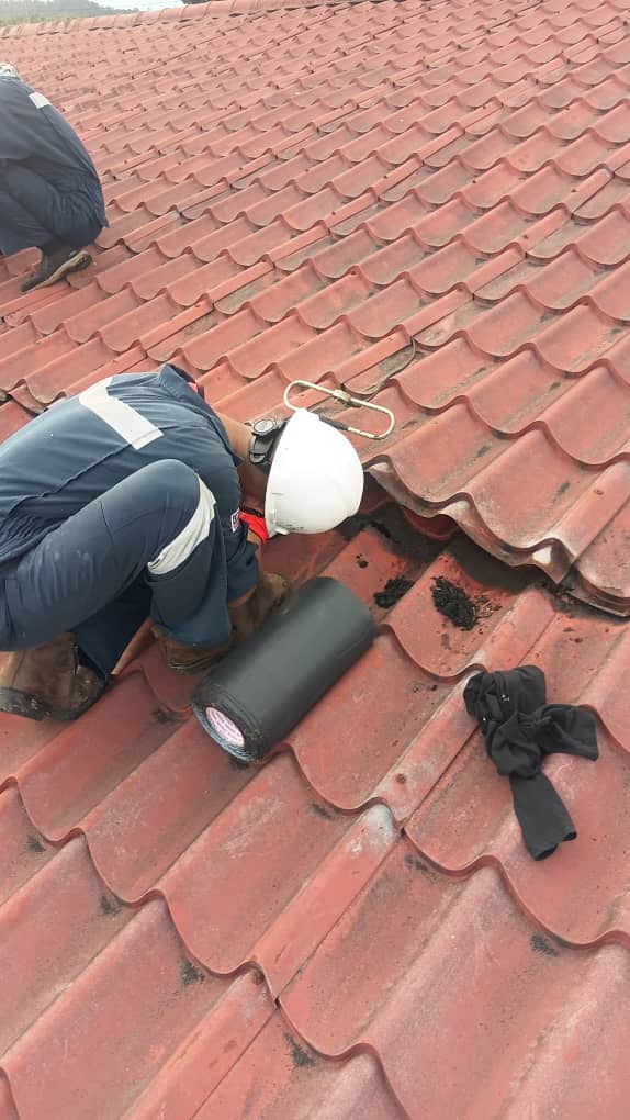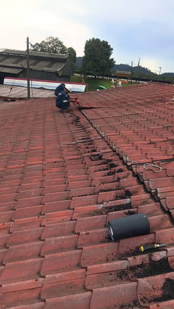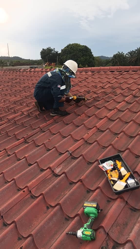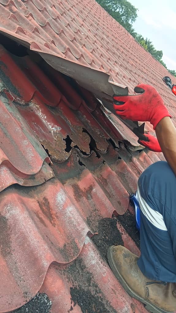 Atap yang telah reput dan berlubang akibat pendedahan berterusan kepada habuk udara dari operasi kilang kelapa sawit. Habuk ini mempercepatkan proses pereputan material atap, menyebabkan struktur menjadi lemah dan mudah bocor. Keadaan ini memerlukan pembaikan segera untuk mengelakkan kerosakan dalaman dan memastikan keselamatan bangunan terjamin.