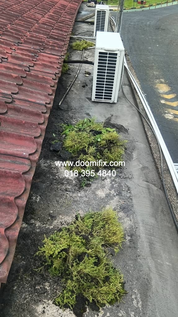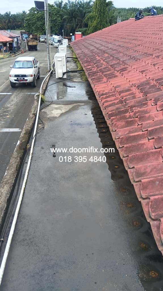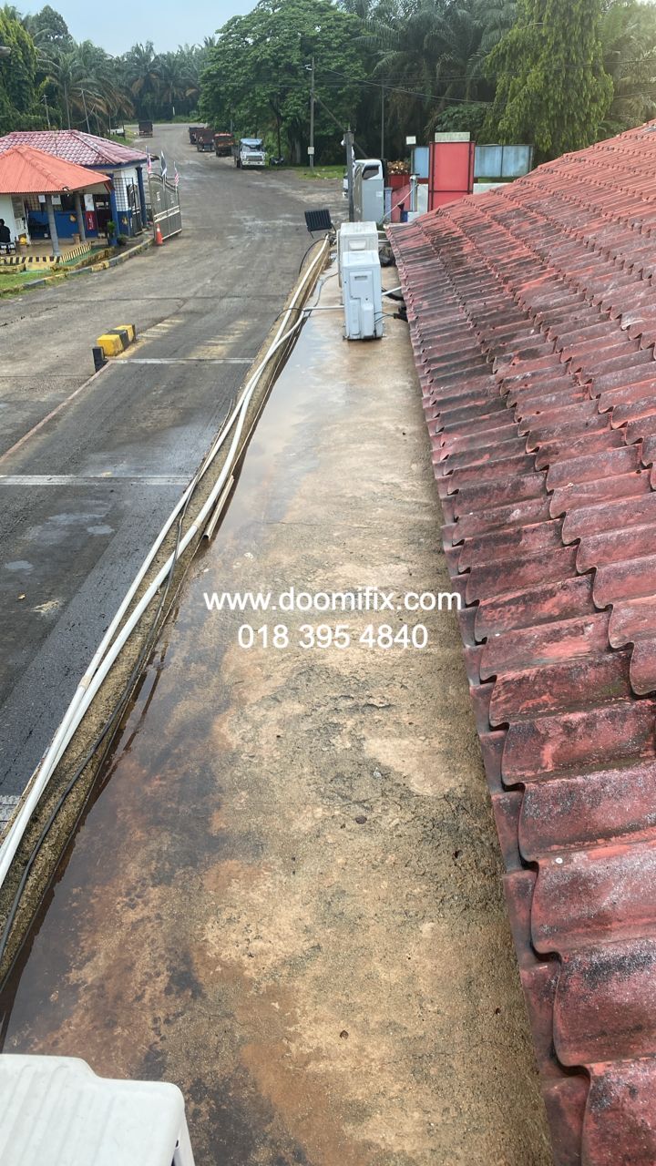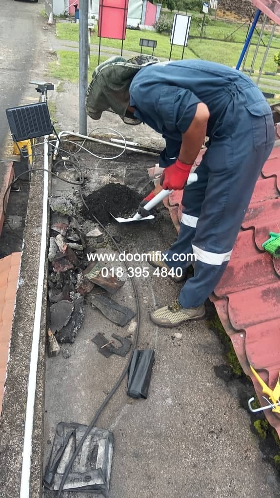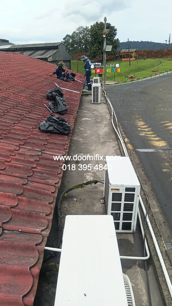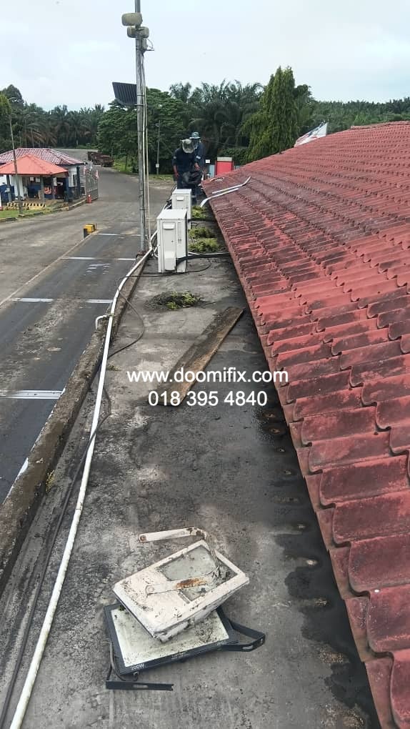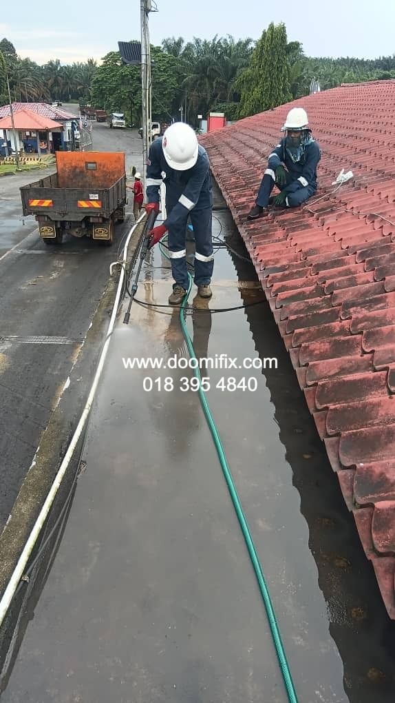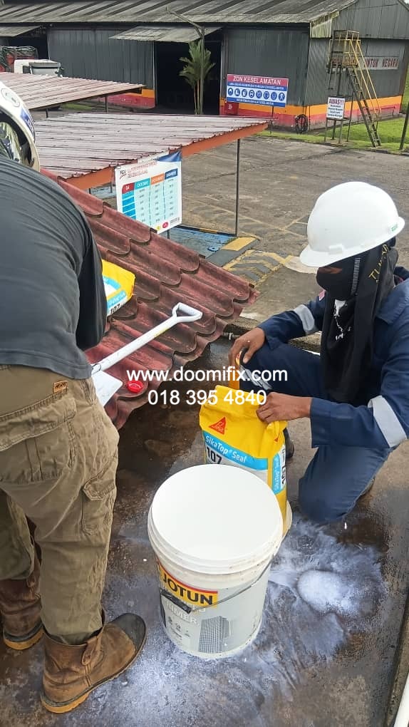 Macam dalam gambar tu, team Doomifix.com tengah buat kerja kat tapak projek — siap panjat bumbung, check kebocoran, bancuh bahan waterproofing, semua on point.